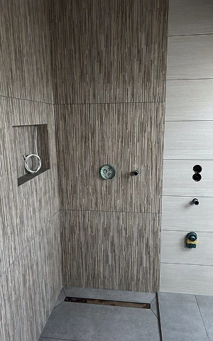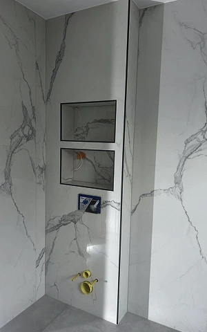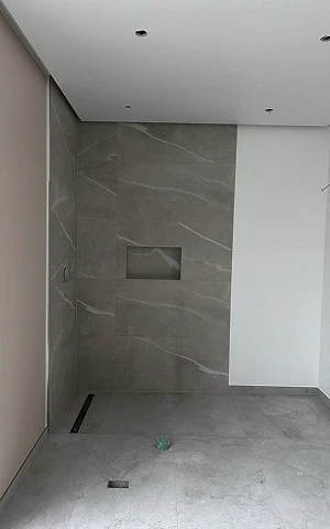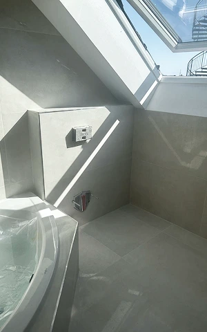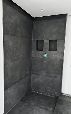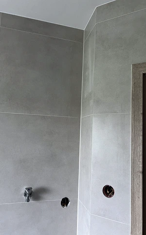 Gesamtes Badezimmer mit großformatigen Fliesen verlegt