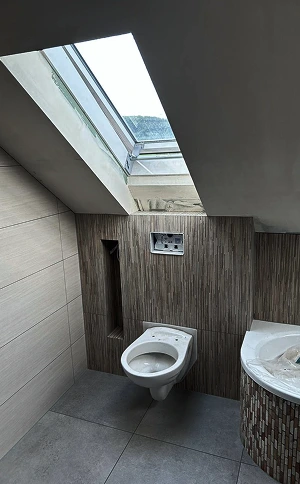 Spülkasten verkleidet, Badezimmer gefliest und Decken gespachtelt sowie gestrichen