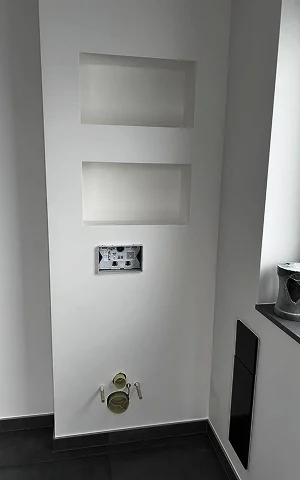 Decke aus Trockenbau, Badezimmer gefliest, Regale und Wände fertiggestellt